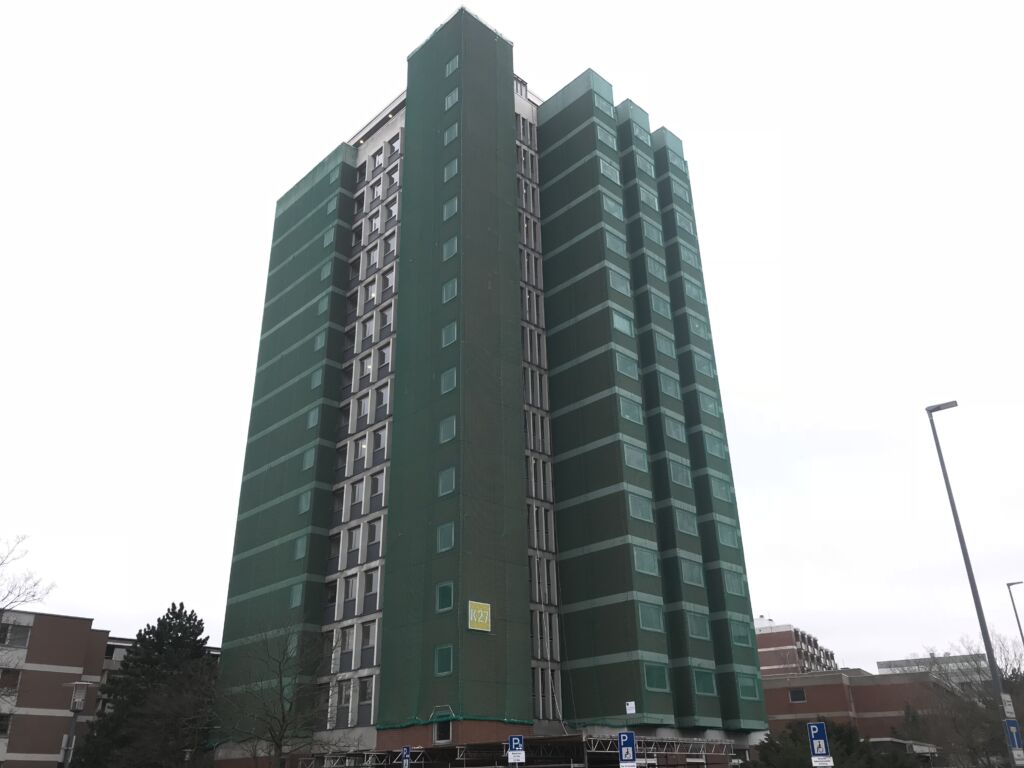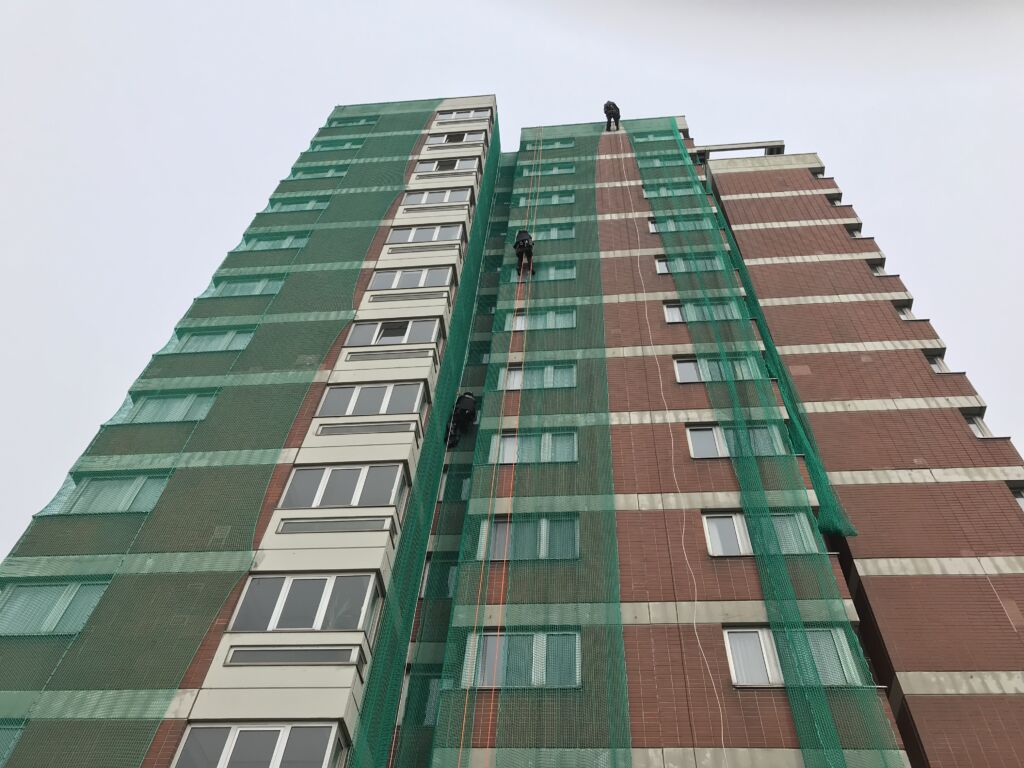 Die Klinkerfassaden von zwei Gebäuden der Medizinischen Hochschule Hannover mussten gegen herabfallende Teile gesichert werden, um die Verkehrssicherheit auf dem Gelände wiederherzustellen. Unser Team erfahrener Industriekletterer hat zwei Schutznetzte in B1-Qualität montiert und die Sicherung somit entsprechend der Brandschutzauflagen durchgeführt. Nach einem Brandtest gemeinsam mit der Feuerwehr wurden die schwer entflammbaren, 4.730 m2 bzw. 2.930 m2 großen Netze mittels der flexiblen Seilzugangstechnik innerhalb von 10 Tagen an den Gebäuden angebracht. Für die Schutzinstallation fallen keine Mietkosten an, sodass die Sanierung der Fassaden ohne Zeitdruck geplant werden kann.