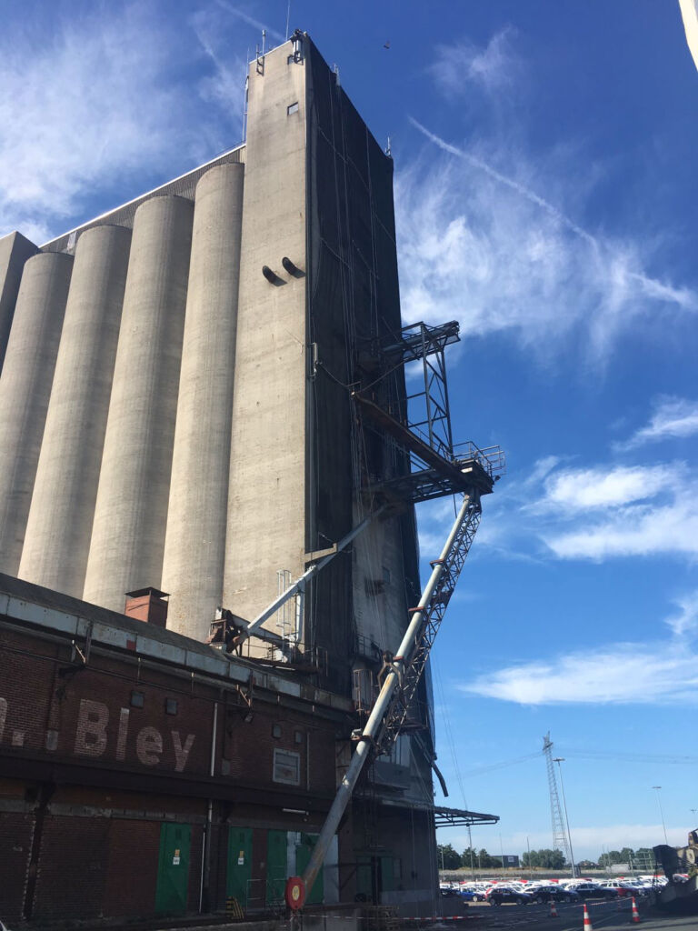 Um den Absturz drohender Betonabbrüche zu verhindern, musste die Fassade der Silos in Emden gesichert werden. Die Anbringung eines Schutznetzes mittels Seilzugangstechnik stellte dafür die effektivste und schnellste Lösung dar. Durch die Montage eines knapp 9.000 m2 großen Fassadennetzes, das aus einem feinmaschigen und einem gröberen Netz besteht und dadurch selbst kleinste Betonteile auffängt, wurde die Verkehrssicherheit auf der Anlage kurzfristig wiederhergestellt. Aufgrund des Zugangs per Seil konnte unser erfahrenes Team die Montage kostengünstig und sicher realisieren.